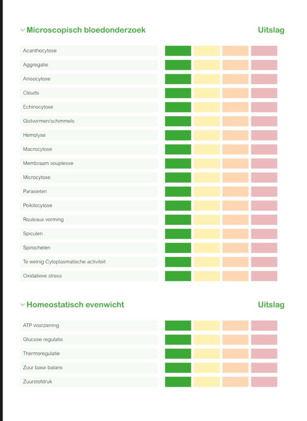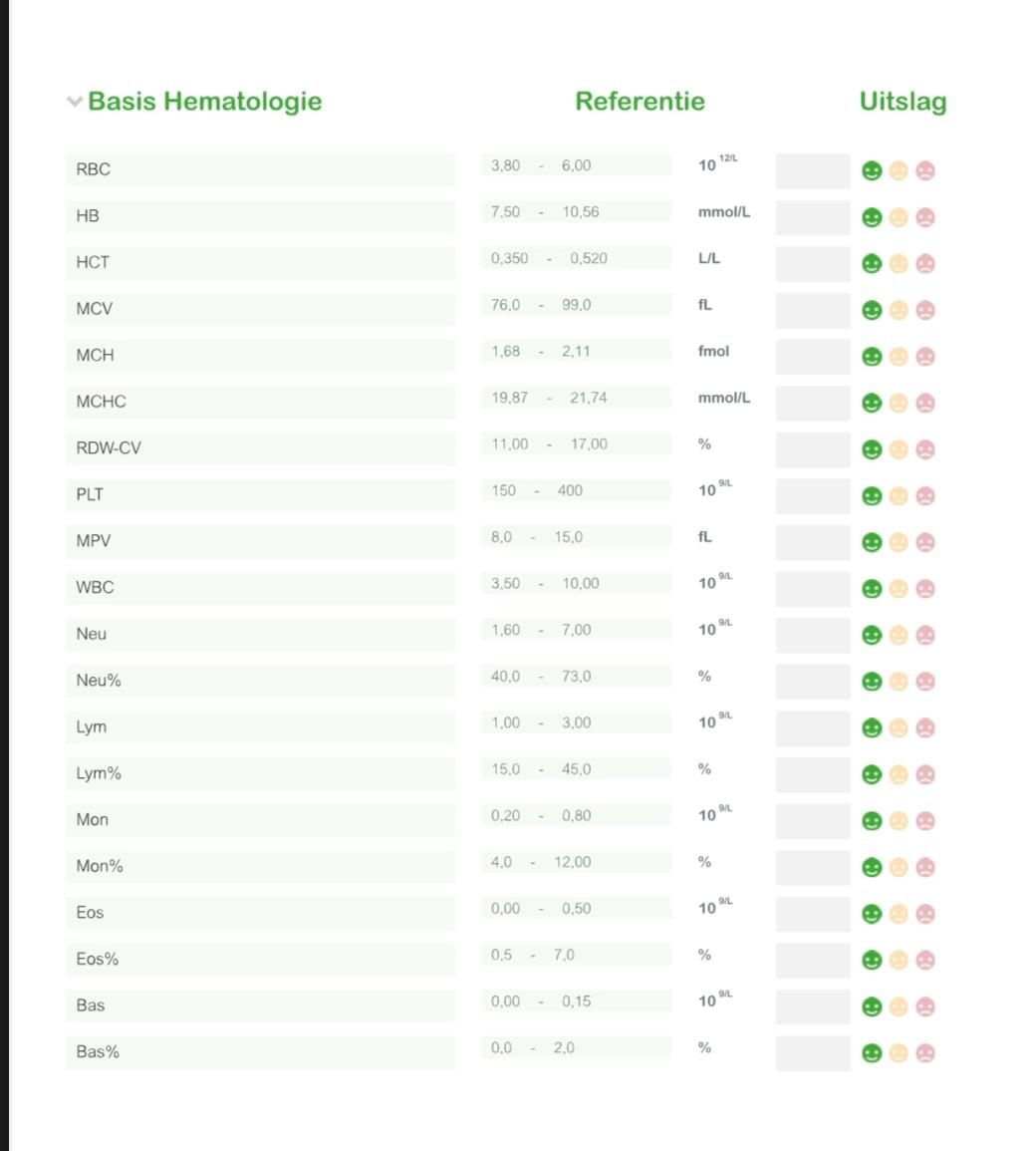 Het eerste deel van de test betreft de hematologie. Dit is dus reguliere gedeelte. De waardes die eruit komen komen overeen met de waardes als je dit bij de huisarts zou laten testen.